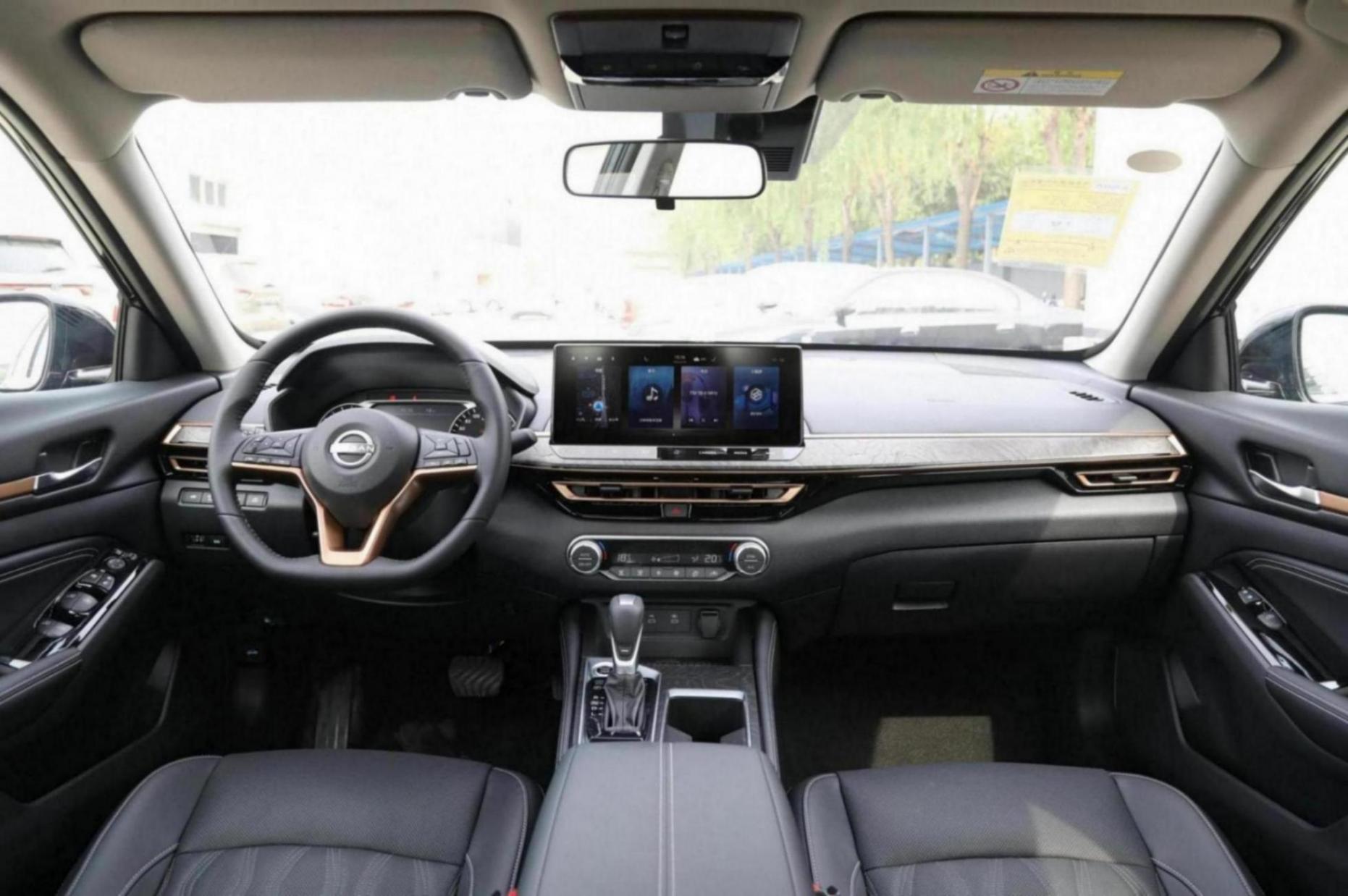 內(nèi)飾以黑色為主色調(diào),中央控制臺(tái)、空調(diào)出風(fēng)口、門板裝飾以及方向盤都增加了金色點(diǎn)綴,提升了豪華感和時(shí)尚感。配備真皮多功能方向盤,7英寸數(shù)字儀表盤和12.3英寸中控觸摸屏,功能齊全且易于操作。Nissan Connect智能系統(tǒng)支持AR導(dǎo)航、車載藍(lán)牙、4G網(wǎng)絡(luò)、OTA升級(jí)、聲紋識(shí)別、語(yǔ)音控制等功能,提升城市駕駛的便利性。空調(diào)控制區(qū)域保留了實(shí)體按鍵和旋鈕,同時(shí)配備分段式可開啟全景天窗。