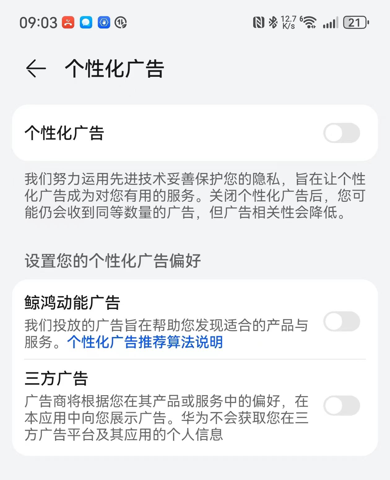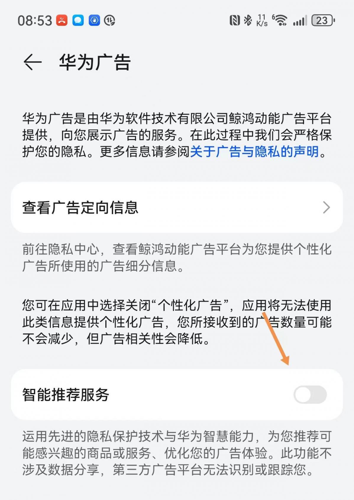 首先呢,第一步我們需要打開設置,打開設置以后呢往下滑動。找到隱私選項,點擊進入,進入里邊以后呢,大家會看到下方有一個華為廣告選項,我們點擊一下,我們關閉智能推薦服務,把華為廣告智能推薦服務呢點擊關閉。這個智能推薦服務可以理解為手機會根據你的興趣去推薦各種廣告,如果你覺得很煩的話,可以把它直接關閉掉。這是第一個需要關閉的選項。