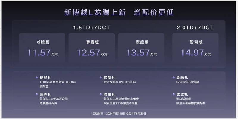 5月19日,吉利新博越L正式上市,新車推出4款車型,官方指導(dǎo)價(jià)11.57~14.97萬元,入門指導(dǎo)價(jià)下探10000元,再享?yè)岝r膨脹禮1000元訂金至高抵10000元、置換補(bǔ)貼12000元等六大購(gòu)車權(quán)益,增配價(jià)更低,實(shí)現(xiàn)國(guó)民主流SUV普及。