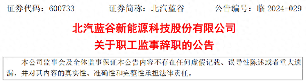 北汽藍谷(600733)發布公告稱,北汽藍谷新能源科技股份有限公司(以下簡稱“公司”)監事會于近日收到職工監事關鍵女士遞交的辭職報告,關鍵女士因工作調整原因申請辭去公司職工監事職務。