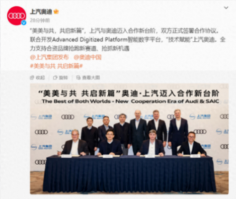 5 月 20 日消息,上汽集團和奧迪汽車聯合宣布,繼去年 7 月份簽署深化戰略合作諒解備忘錄后,雙方正式簽訂合作協議,共同為上汽奧迪開發多款高端智能電動車,并聯合開發 Advanced Digitized Platform 智能數字平臺。