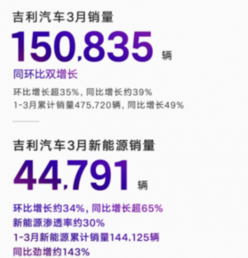 吉利3月份勢頭還不錯。月銷量超15萬輛,同環比雙增長均高于35%。其中新能源滲透率約30%,銷量接近4.5萬輛,主要依賴吉利銀河系列、幾何系列與極氪品牌的持續發力。走高端路線的極氪借小米輿論也漲了一波流量,3月交付了超1.3萬臺
