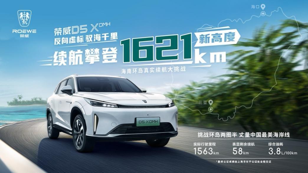 榮威D5X DMH搭載1.5T混動專用發動機,匹配2擋DHT混動專用變速箱。官方給出百公里加速6.9S,CLTC純電續航 135KM,滿油滿電油耗續航可以達到1300km。而在今年年初的海南環島實測中,榮威D5X DMH 更是以1621km的真實綜合續航和3.8L的實測百公里平均油耗,展現了超凡的高效節能實力。