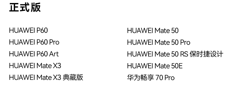 根據公布的升級清單,華為P60、華為P60 Pro、華為P60 Art、華為Mate 50、華為Mate 50 Pro、華為Mate 50 RS保時捷設計、華為Mate 50E、華為Mate X3及典藏版在HarmonyOS 4.2正式版的升級之列,出乎意料的是,定位中端華為暢享70 Pro也在此次升級之中,另外華為MatePad 2023也可以升級。