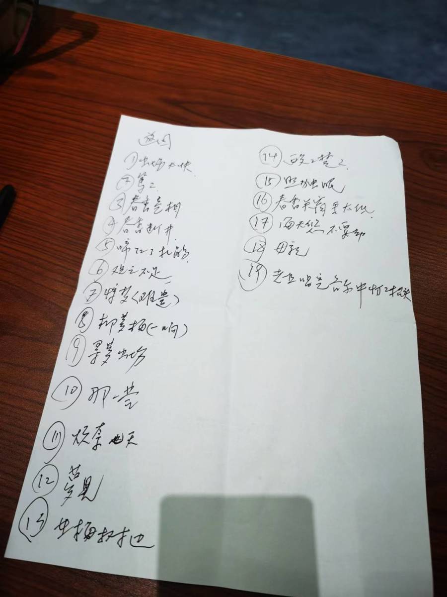 1點到3點,梁谷音始終沒有離開座位,姿勢幾乎沒有變。她的桌子上放著一張白紙。3點多排練結束,紙上寫了十多條,字不多,每個都有硬幣大小。梁谷音看了一眼紙,拉著煉雯晴摳細節,“跟著鑼鼓走,眼睛不要看觀眾;走太快,是心里沒有譜……”