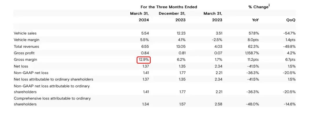 雖然營收少,還有不少虧損,但小鵬的毛利率卻漲了不少。一季度小鵬整體毛利率為 12.9%,同比和環比都出現了一定程度的增加,其中汽車毛利率達到了5.5%。