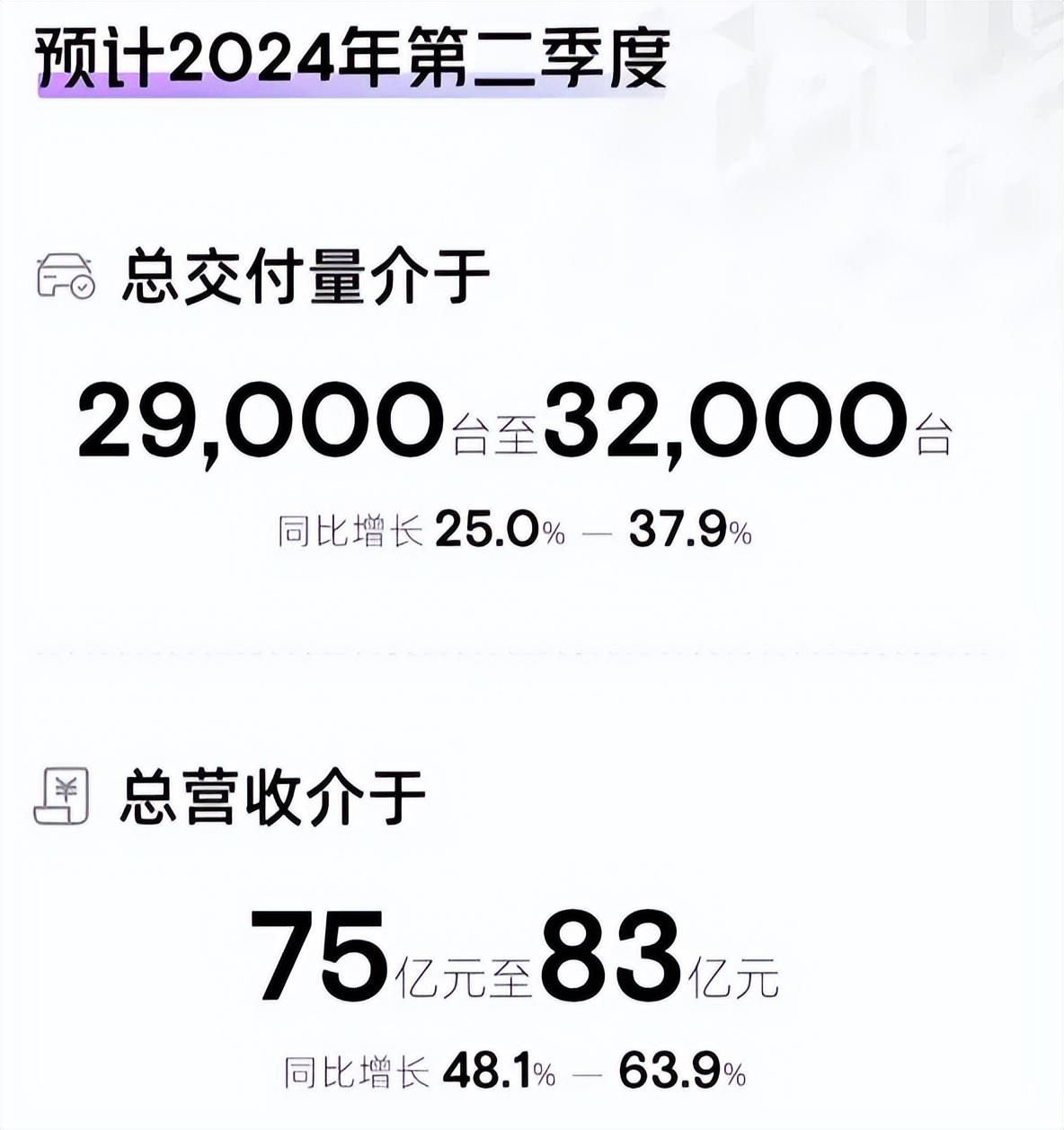 根據第二季度最新指引,小鵬預計營收將介于75億至83億元人民幣之間,交付指引則為2.9萬至3.2萬輛