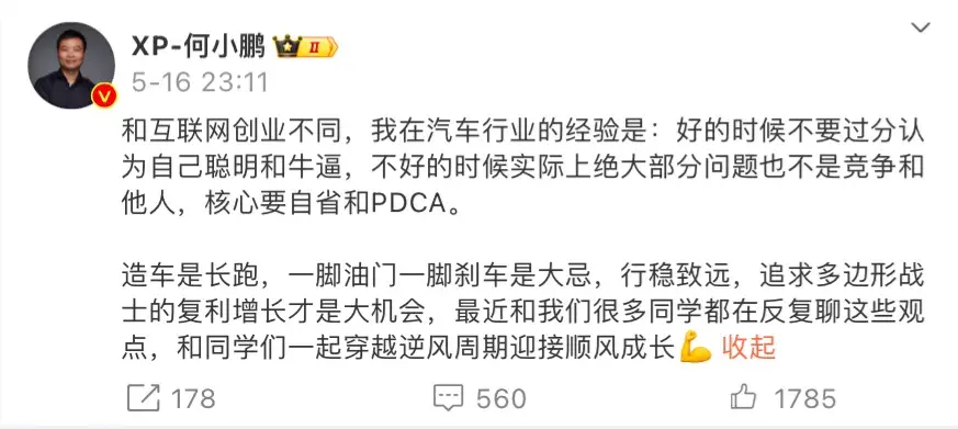 公布一季度財報前,何小鵬曾在社交平臺深夜發文,稱造車是長跑,行穩才能致遠。