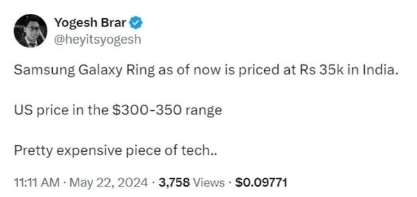 爆料人士Yogesh Brar在最新推文中提到了三星Galaxy Ring的美國價格范圍。據爆料,三星Galaxy Ring的美國售價約為300至350美元,約合人民幣2200元至2500元。作為對比,Oura Ring 3的Heritage版本起價為299美元,Rose Gold Horizon版本最高為549美元。