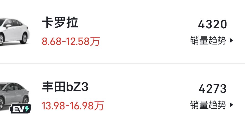 這款豐田電動車的銷量已經和卡羅拉差不多了,沒錯,就是這款剛上市就被罵到差點退市的豐田bZ3,在今年的4月份賣了4273輛,而卡羅拉才賣了4320輛。現在買豐田的油車還算可以理解,圖個省油耐用,但是買豐田的電車圖啥呢,定價這么貴,用的還是比亞迪的電芯,名字還這么奇葩。