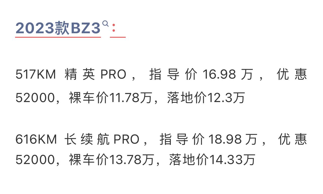 廢話不多說,分享一下5月份bZ3的真實行情。517千米續航精英PRO版,指導價16.98萬,現在終端能優惠5.2萬,裸車都不到11.8萬,落地在12.3萬上下。616KM長續航PRO版,優惠后實際落地價在14.3萬左右。