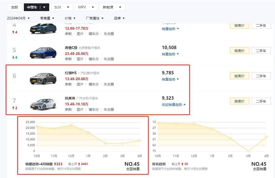 本來全新凱美瑞和新款雅閣走的是不一樣的路線,不僅換了外觀和內飾,也對2.0L HEV油電混動系統進行了小幅的優化提升,更難得與華為合作優化了車機的底層操作邏輯和應用生態,在高通驍龍8155芯片的加持下,理應獲得市場的關注才對,但事情并沒有朝著理想的方向發展。全新凱美瑞上市首月銷量6824輛,4月份銷量9323輛,從原來榜一的位置跌到了榜單第七,甚至不及紅旗H5的4月銷量。這問題到底出在了哪里?是因為價格嗎?