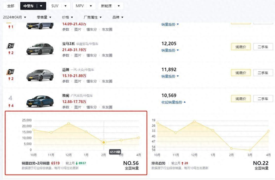 說白了,和本田雅閣也算是“同道中人”。在全新凱美瑞上市前,雅閣也迭了一次代,但這次升級可謂是“不痛不癢”,1.5T發動機為了滿足國內苛刻的國六b排放,發動機最大輸出功率下調2匹馬力,只針對外觀、內飾進行了優化。因為新款雅閣失去了第十代雅閣經典的溜背轎跑外觀,故而導致新款上市后銷量直接腰斬,靠著如今終端4-5萬的現金優惠才勉強登上中型轎車細分市場的銷量Top10。