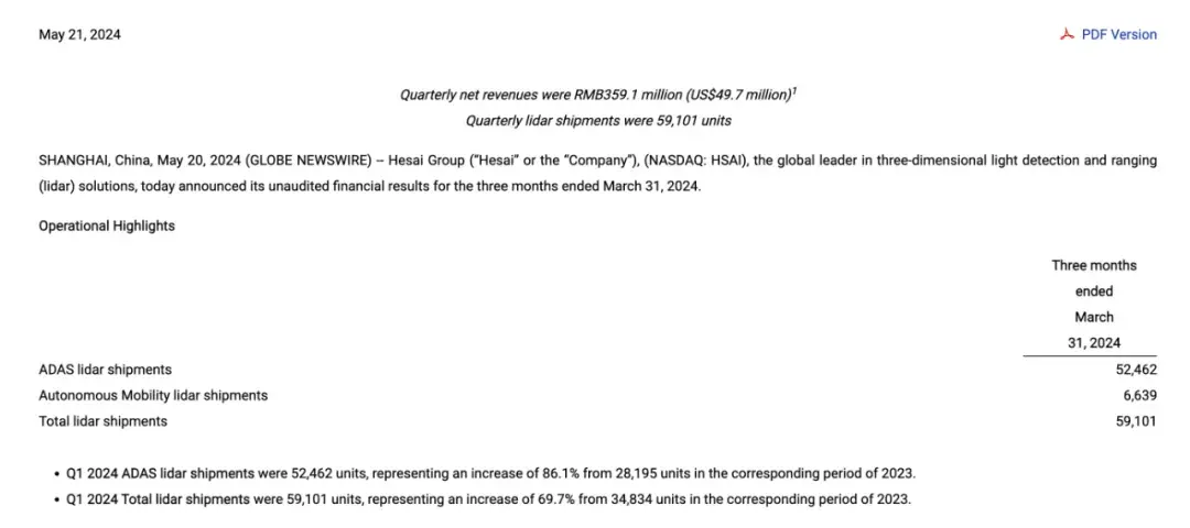 幾乎是同一時間,速騰與禾賽兩家頭部激光雷達玩家,2024年第一季度財報發布。
