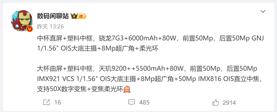 配置上,根據知名博主“數碼閑聊站”的爆料,vivo S19搭載高通的驍龍7 Gen 3中端芯片,vivo S19 Pro搭載聯發科的天璣9200+旗艦級芯片。