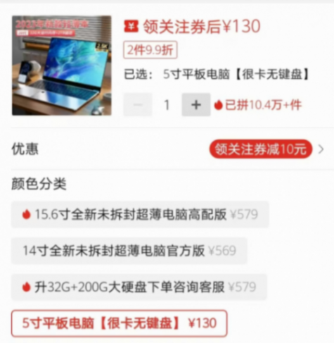 舉個例子,在平臺上搜索電腦,滿屏展示都是幾十塊錢、幾百塊錢的價格,但是真正進入店鋪才發現,展示的價格也許是殘次品的價格,也許是某個零部件的價格。