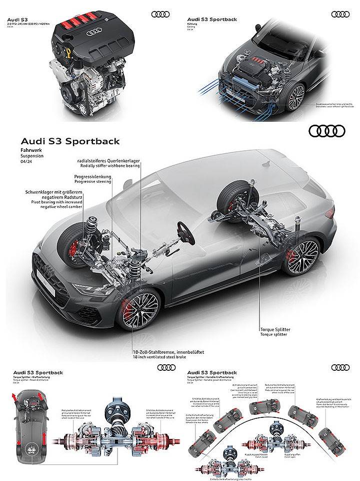根據原廠資料顯示,奧迪還為小改款 S3 的 7 速 S tronic 變速系統進行強化,變速系統擁有更快反應速度,奧迪小改款 S3 從靜止加速到時速 100 公里,所需時間為 4.7 秒,相比小改款前縮減了 0.1 秒,極速則是設定在時速 250 公里之譜。奧迪 還為 S3 導入了源自 RS 3 的扭矩分配系統 (torque splitter),系統能主動調配后軸之間的扭矩輸出分配比例,更進一步強化操控實力。