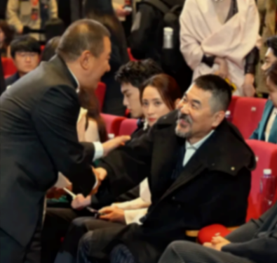 其妻子蔣勤勤只是微微抬頭掃了一眼,看到是丁勇岱后,話也沒說一句,就低頭繼續看手機了。不同的是,陳建斌與張藝謀見面時的態度則是截然相反。反而是坐在第二排的吳剛和董勇頁站起來跟丁勇岱打了招呼。