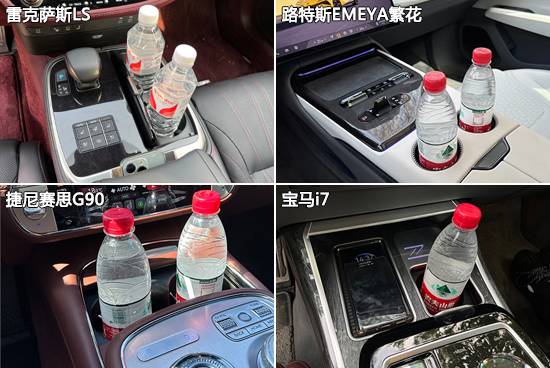 四款車型中,儲物空間最多的是寶馬i7,但是能將所有測試物品完美碼放的卻是雷克薩斯LS和捷尼賽思G90。路特斯EMEYA繁花因為沒有配備眼鏡盒,所以墨鏡找不到合適的位置存放,而寶馬i7則有挎包和墨鏡兩樣物品沒有合適的碼放位置。