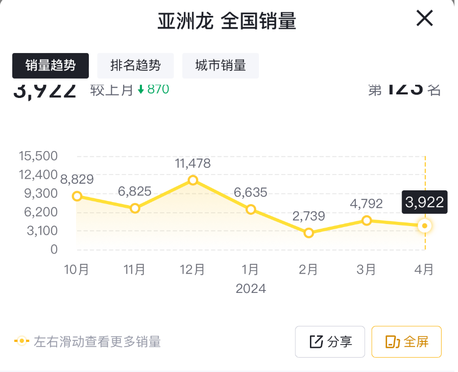 從這個層面來講,2024年4月份,亞洲龍的市場表現,要略顯遜色于同期國內狹義乘用車零售市場的整體表現。