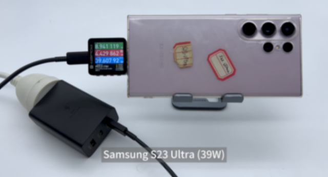 為 Samsung S23 Ultra 充電,使用 POWER-Z KM003C 測試儀測得功率為 8.94V 4.43A 39.61W。
