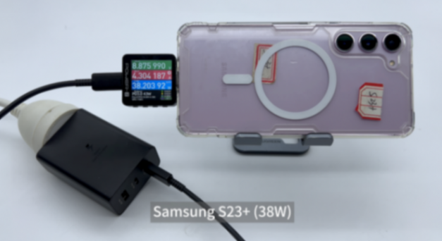 為 Samsung S23+ 充電,使用 POWER-Z KM003C 測試儀測得功率為 8.88V 4.30A 38.20W。