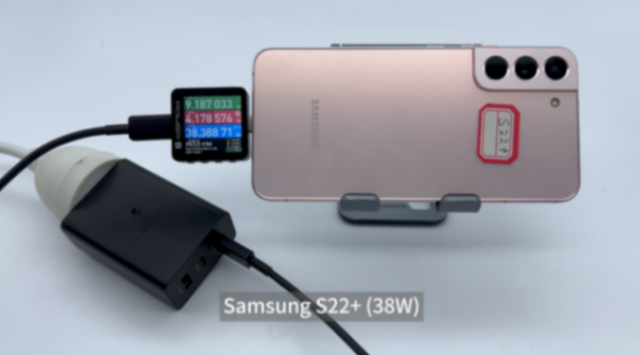 為 Samsung S22+ 充電,使用 POWER-Z KM003C 測試儀測得功率為 9.19V 4.18A 38.39W。
