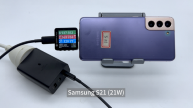 為 Samsung S21 充電,使用 POWER-Z KM003C 測試儀測得功率為 8.94V 2.36A 21.13W。