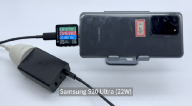 為 Samsung S20 Ultra 充電,使用 POWER-Z KM003C 測試儀測得功率為 8.82V 2.59A 22.88W。