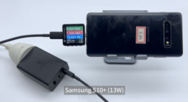 為 Samsung S10+ 充電,使用 POWER-Z KM003C 測試儀測得功率為 8.87V 1.52A 13.52W。