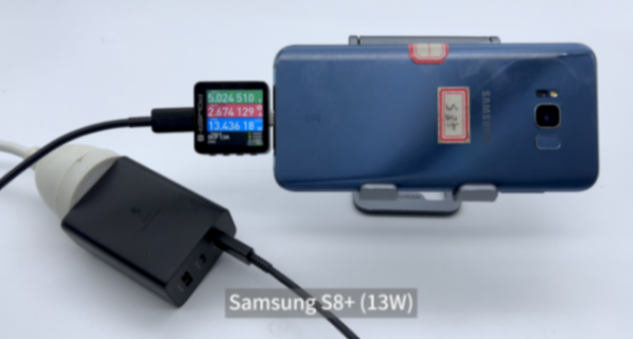 為 Samsung S8+ 充電,使用 POWER-Z KM003C 測試儀測得功率為 5.20V 2.67A 13.44W。