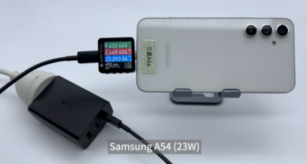 為 Samsung A54 充電,使用 POWER-Z KM003C 測試儀測得功率為 9.43V 2.47A 23.29W。