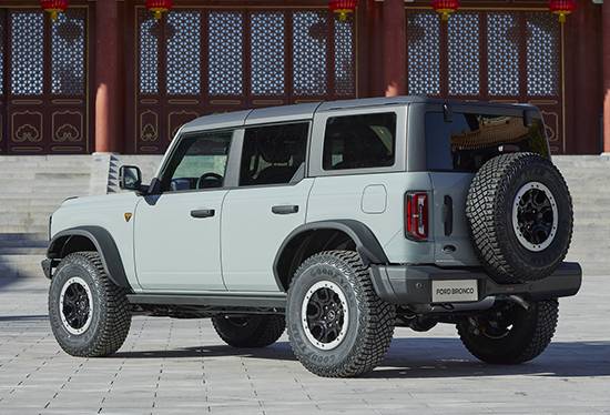 車側(cè)線條比較規(guī)整,算是標準的硬派“方盒子”造型,很有辨識度。尺寸方面,新車長寬高分別為4825mm*2070mm*1990mm,軸距為2950mm。車尾采用經(jīng)典的豎置尾燈設計,并且還配有外掛式備胎,尾門為側(cè)開式。據(jù)悉,福特烈馬的車頂支持三段式可拆卸,通過工具輔助還可以拆卸車門,并將其放置在后備廂內(nèi)。