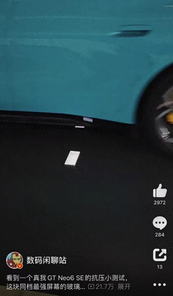 從網友發布的測試視頻來看,真我GT Neo6 SE機身正面朝上,小米SU7直接加速碾壓真我GT Neo6 SE。結果真我GT Neo6 SE被汽車后輪壓得飛起,但是得益于受力屏幕用的是旗艦同款的康寧大猩猩玻璃Victus2,同時整機堆疊結構也做了加強,真我GT Neo6 SE屏幕并沒有碎裂,機身也沒有彎曲。