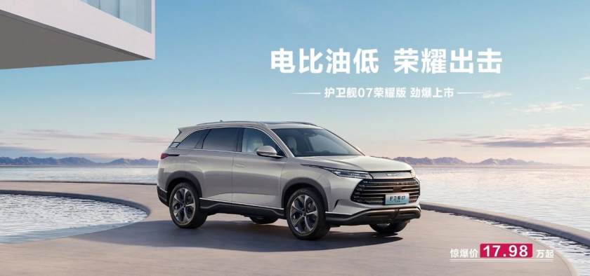 護衛艦07榮耀版售價區間為17.98萬元-25.98萬元。此次升級,護衛艦07榮耀版新增貝殼白內飾,并將車機系統升級至智能座艙高階版-DiLink 100,顏值和智能雙雙提升。此外,護衛艦07榮耀版還對6kWVTOL移動電站、10.25英寸全液晶儀表、50W手機無線充電等重點配置進行全系標配,并帶來全系可享7kW壁掛充電盒及免費安裝的貼心權益,用車體驗全面升級。