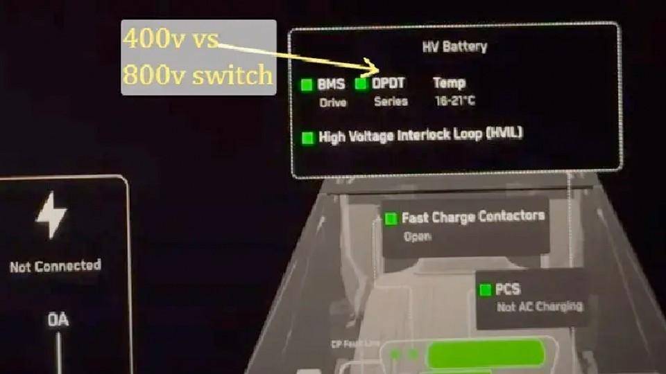 為什么會有這種猜測,說Model Y會用局域800V高壓系統。Cybertruck和Model Y 電池的集成思路是相似的,總共都是有4個模組,沿縱向布置,每個模組的電壓在200V以上。然而,在這種布局下,特斯拉實現400V和800V共存的方案,是可以通過DPDT這個零部件來實現的,就是說通過對4個模組的串、并聯進行組合,就可以實現不同的電壓平臺。