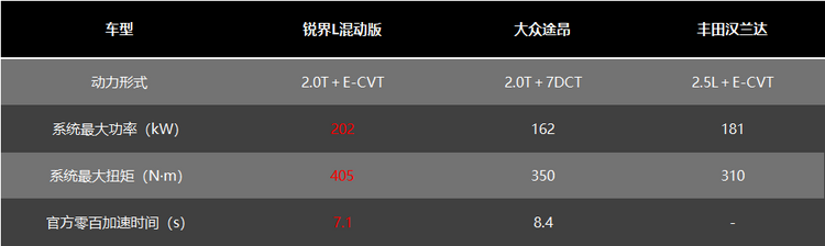 以大眾途昂和豐田漢蘭達(dá)為例,2.0T的大眾途昂最大功率162kW,零百加速8.4秒,最新款的漢蘭達(dá)2.5L雙擎版本車型,同樣都有電池加持,系統(tǒng)最大功率也才181kW,相比之下,銳界L超過200kW的最大功率,動(dòng)力性能要好得多。