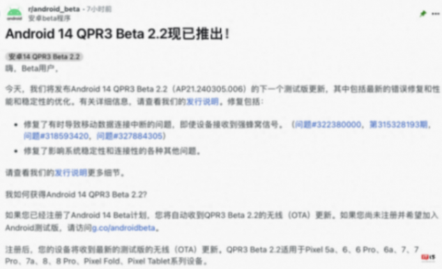 5 月 24 日消息,谷歌現已向符合條件的 Pixel 手機推送了安卓 14 QPR3 Beta 2.2 更新,該更新主要修復了手機偶發的流量“斷流”問題,同時改善了系統穩定性,預計相關包將在 2024 年 6 月作為穩定版正式推送。