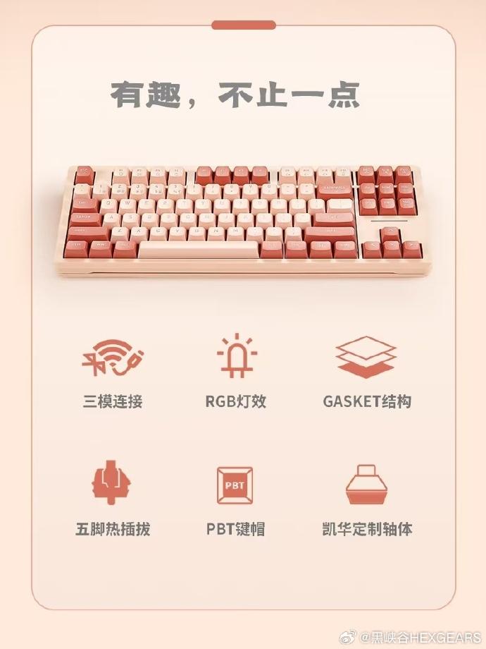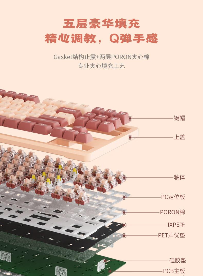 連接方面,其支持藍牙 / 2.4G / 有線(Type-C)三模連接。結構上,其采用五層填充架構,包含 Gasket 結構止震和兩層 PORON 夾心棉。