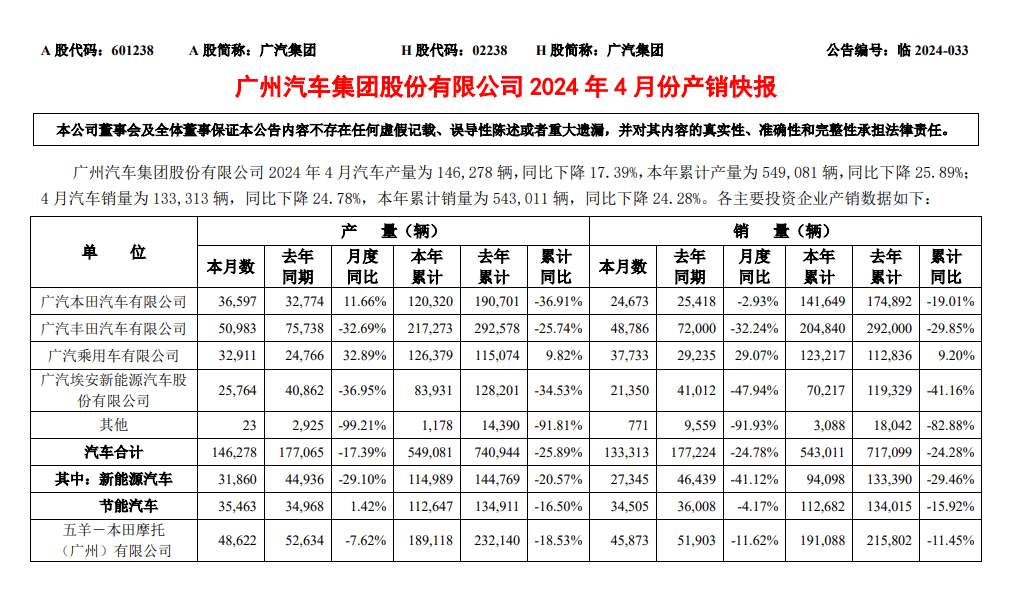 受廣汽豐田持續下滑影響,廣汽集團市場表現同樣糟糕。根據廣汽集團公布產銷量快報顯示,廣汽集團前4個月累計銷量為 543,011輛,同比下降 24.28%。