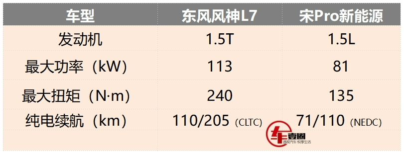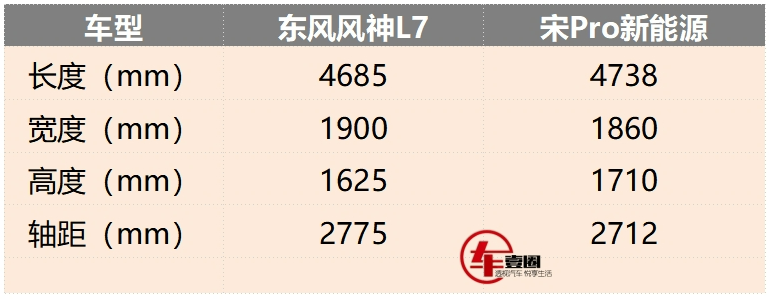 空間上,新車的長寬高分別為4670/1900/1625mm,軸距為2775mm,已經可以媲美中型SUV身板了。通過表格對比我們也可以看到,東風風神L7在車身寬度以及軸距上,比宋Pro新能源更有優勢,車內空間表現無疑更加充滿期待。
