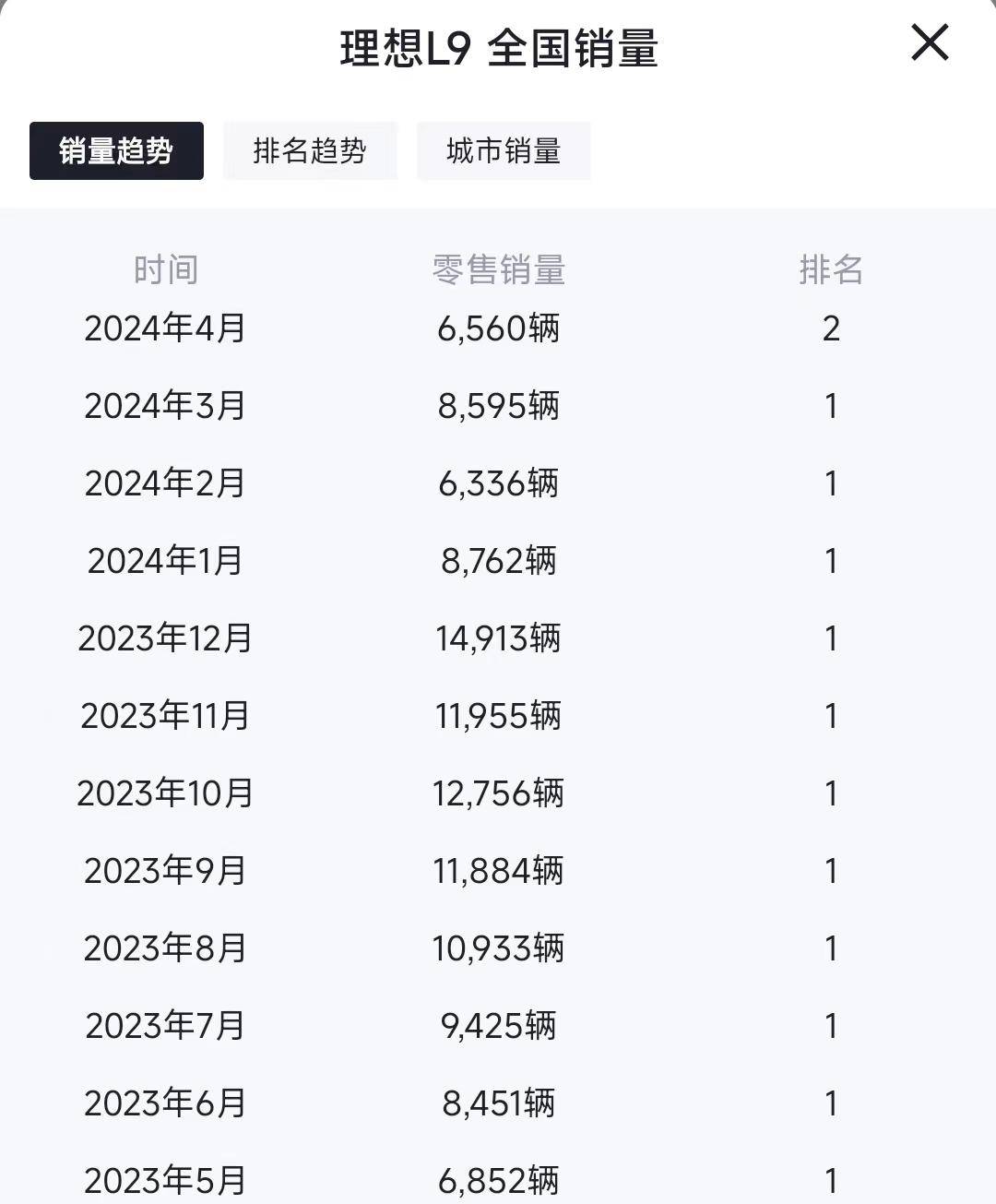 再看L9,L9的銷量,在2024年1月到4月,都未能突破萬輛,而在2023年6月到132月,有5個月份突破的一萬臺,可見,L9現在的銷量壓力也不小。當然,對于40萬以上的售價車型,有這個銷量也實屬不易。
