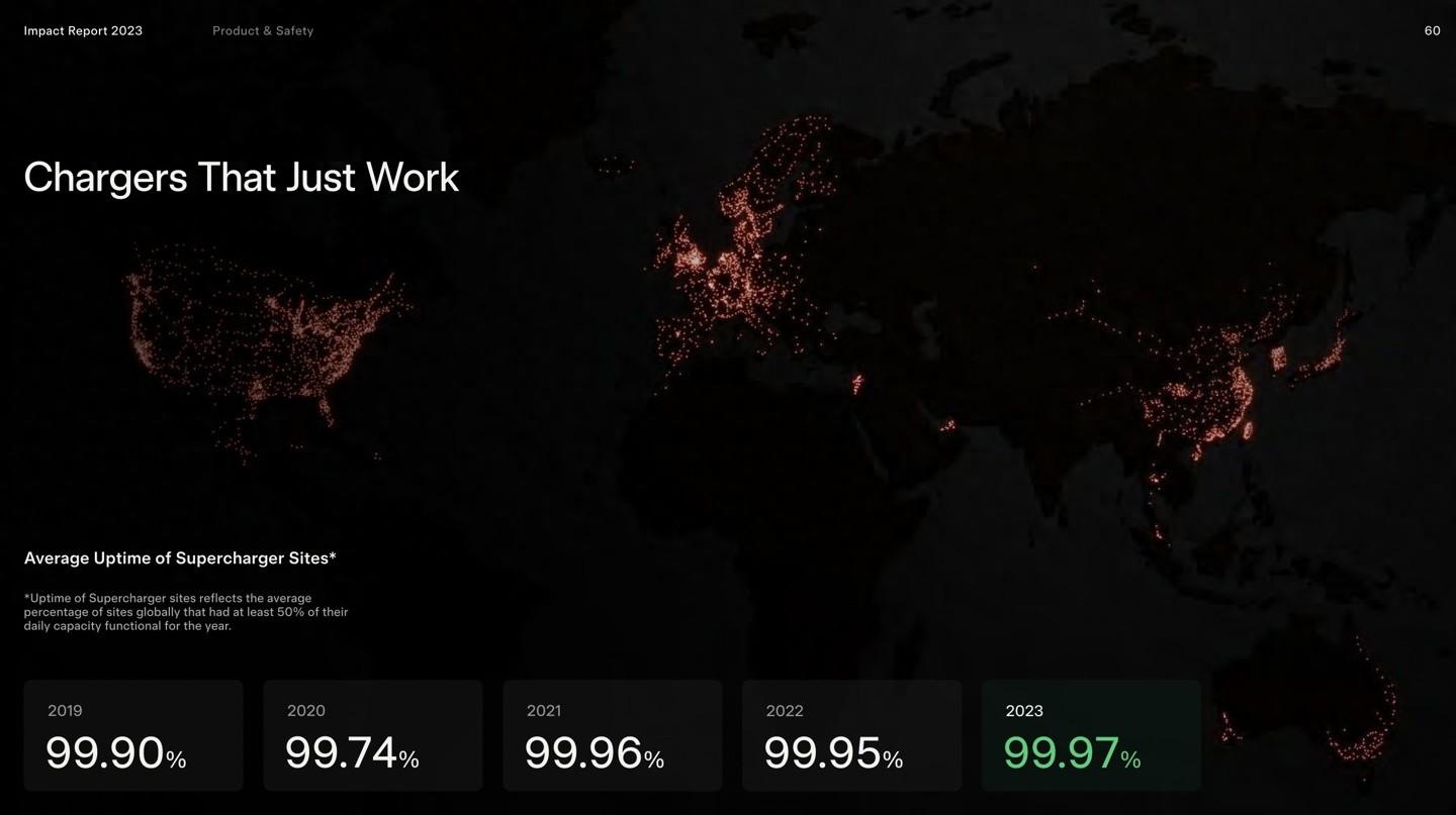 2019 年,超級充電網絡的平均正常運行時間為 99.90%。2020 年,該網絡的平均正常運行時間略有下降,當時系統的得分為 99.74%。 2021 年和 2022 年分別上升至 99.96% 和 99.95%。