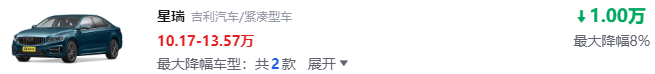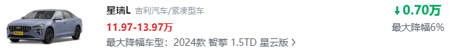 第二款吉利星瑞L智擎版,此車在2023年年底剛上市的一款車型,性價比方面還都不錯。官方售價12.67萬至14.67萬,上市總計有三款車型,目前隨市場壓力加大,此車最大降幅6%來到7,000塊錢,但事實上是能夠做到7,000-1萬之間,因此此車就完全殺到了11萬級別。