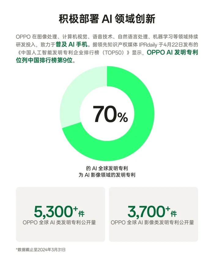 截至2024年3月31日,OPPO全球AI發(fā)明專利公開數(shù)量已經(jīng)達(dá)到了5300件,全球AI影像專利超3700件。根據(jù)《中國人工智能發(fā)明專利企業(yè)排行榜》,OPPO擁有的AI專利數(shù)量位列中國排行榜第9位。