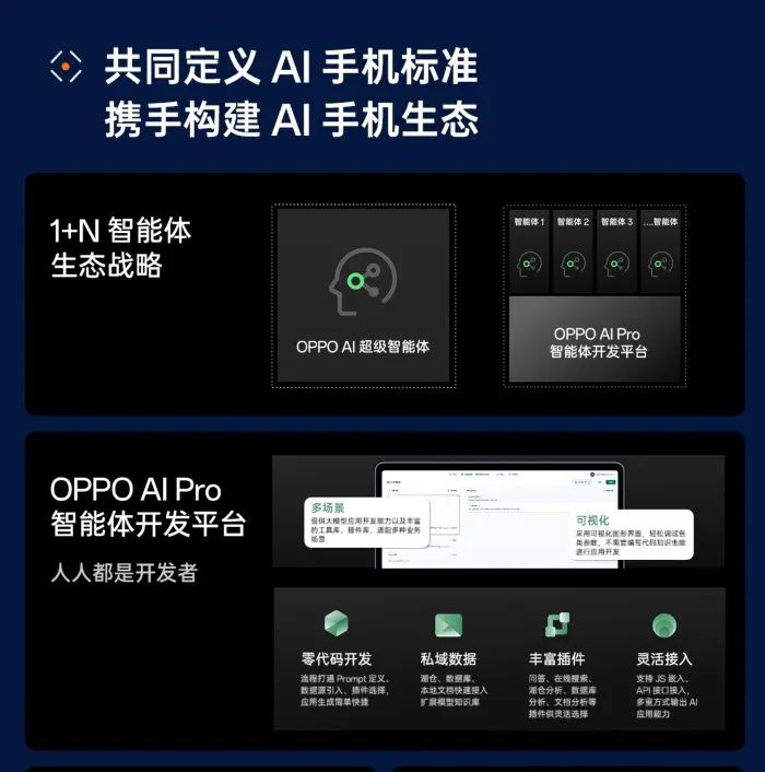 與此同時(shí),OPPO還宣布了1+N的智能體戰(zhàn)略。其中,1代表OPPO AI超級(jí)智能體,通過文檔、搜索引擎、知識(shí)圖譜等,能夠理解用戶的意圖,為用戶提供精準(zhǔn)的知識(shí)支持。而N指的是OPPO AI Pro智能體平臺(tái)所賦能的智能生態(tài)。用戶無需精通編程,就可以與AI進(jìn)行自然交互,得出理想的結(jié)果。