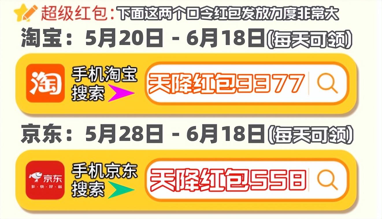 首先,劃重點!今年的淘寶618紅包口令是「天降紅包3377」,京東的618紅包口令是「天降紅包558」記得每天去領,因為領的紅包大小和你搜索的什么口令有關哦!