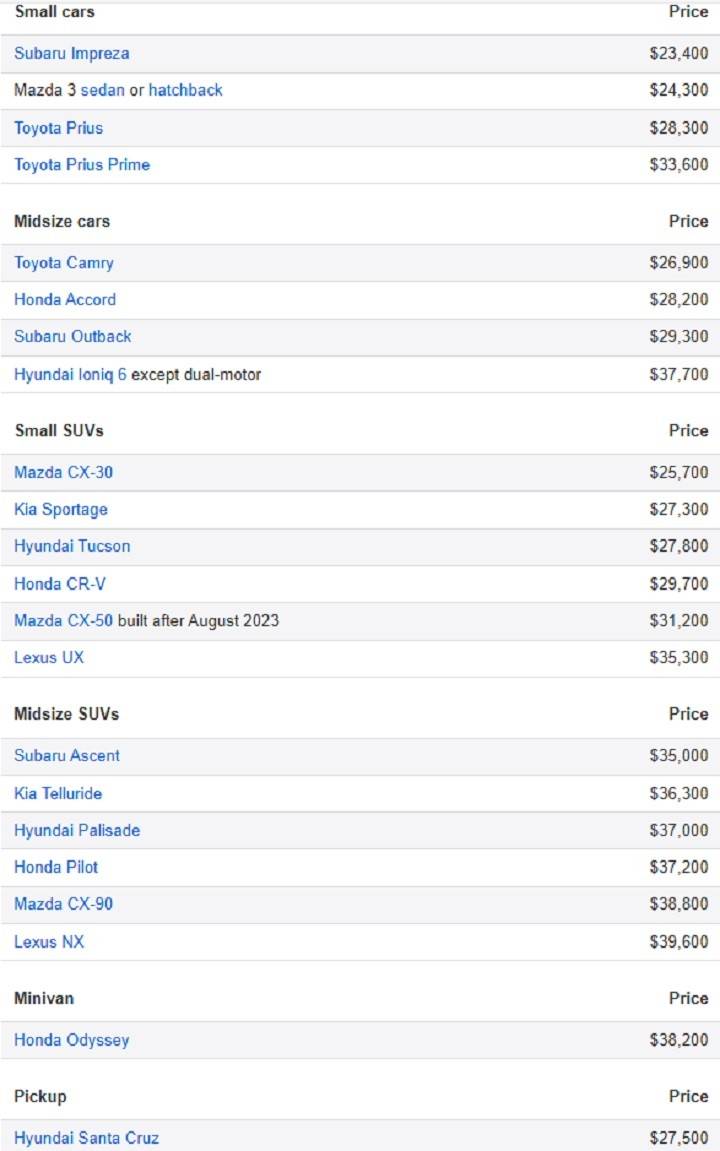 Mazda 3 車系、Subaru Outback、Honda CR-V、Lexus UX、NX、Honda Odyssey 等車款都再度受肯定,而包括 Toyota Prius、Toyota Camry、Honda Accord、Mazda CX-30、Kia Sportage、Hyundai Tucson、Mazda CX-90 等新客入圍。并且在電動車市場逐漸擴大之時,其也推薦了 1 款純電車 Hyundai Ioniq 6 ( 排除雙馬達車型 ) ,但是 IIHS 也提到,雖然基本上電動車與汽油車一樣安全,但在加速性方面更為出色,因此年輕駕駛更須小心才行。