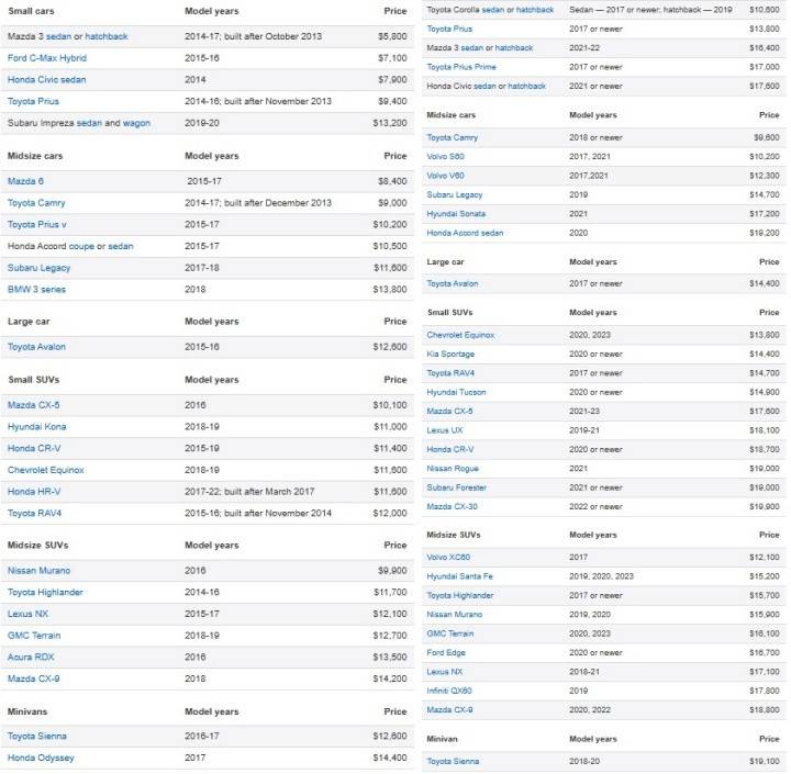 IIHS 與 CR 共同發布符合年輕駕駛適合的車輛中,最注重的莫過于安全性的方面,同時在價錢上也不能太高,這回 58 款二手車的價格落在 5,800 美元 ~19,900 美元不等,同時推薦的二手車中都在 IIHS 前方小面積碰撞中拿到 Good 優良或 Acceptable 可接受,而二手車也分為 Best 與 Good 兩種級別,Best 等級的二手車更是標配了 AEB 自動剎停。