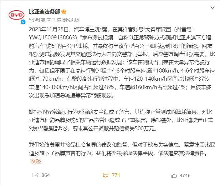 近日,比亞迪法務(wù)部官方發(fā)文稱,將起訴汽車博主“姚*強(qiáng)”,要求其公開(kāi)道歉并賠償損失500萬(wàn)元。此信息公布之后,迅速霸占熱搜。